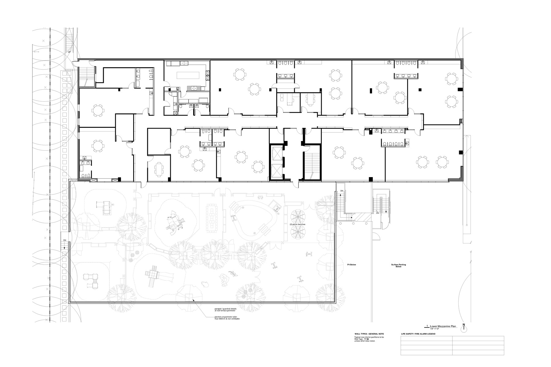 The project interiors include a kitchen, gross motor playroom, offices, and family area. The roof deck was transformed into a series of separated outdoor play areas designed for specific numbers of children and age groups.