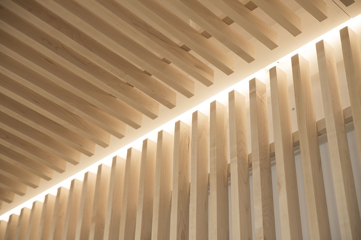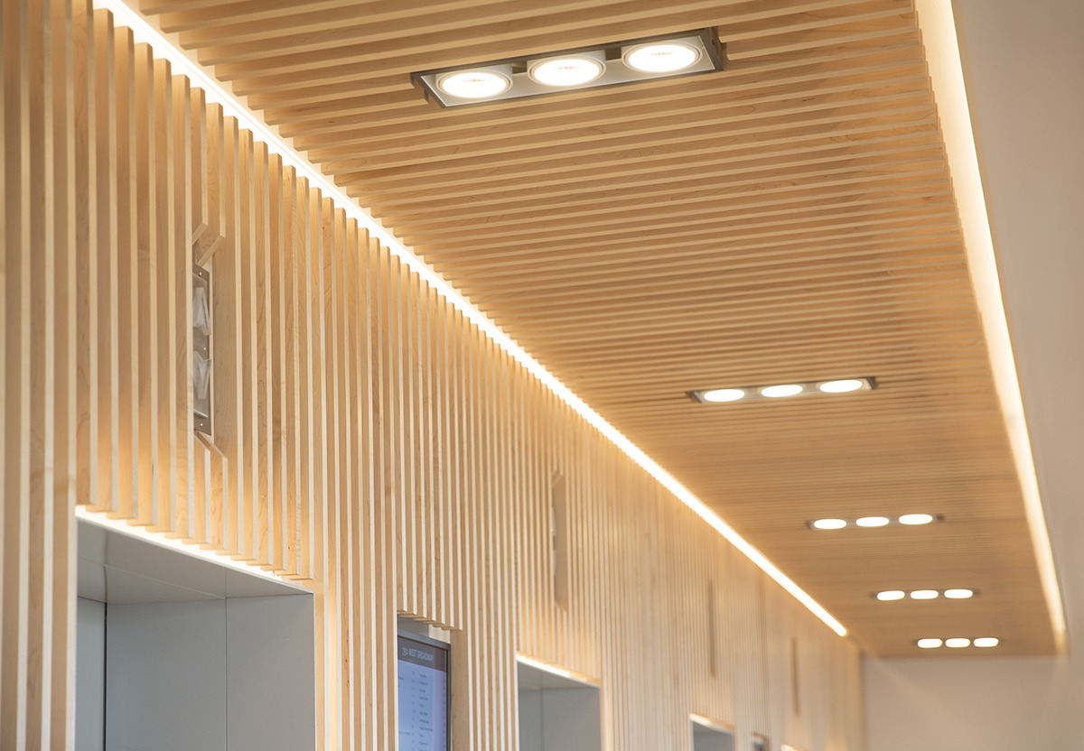 The street-level façades are clad in dark basalt stone. A new canopy along Broadway accentuates the prominent street corner. The entry courtyard and lobby design create a strong connection between the lobby and the street, with an open mezzanine introducing natural light and materials. A wood screen extends from the lobby to the mezzanine, creating an inviting atmosphere and drawing people toward the elevators.