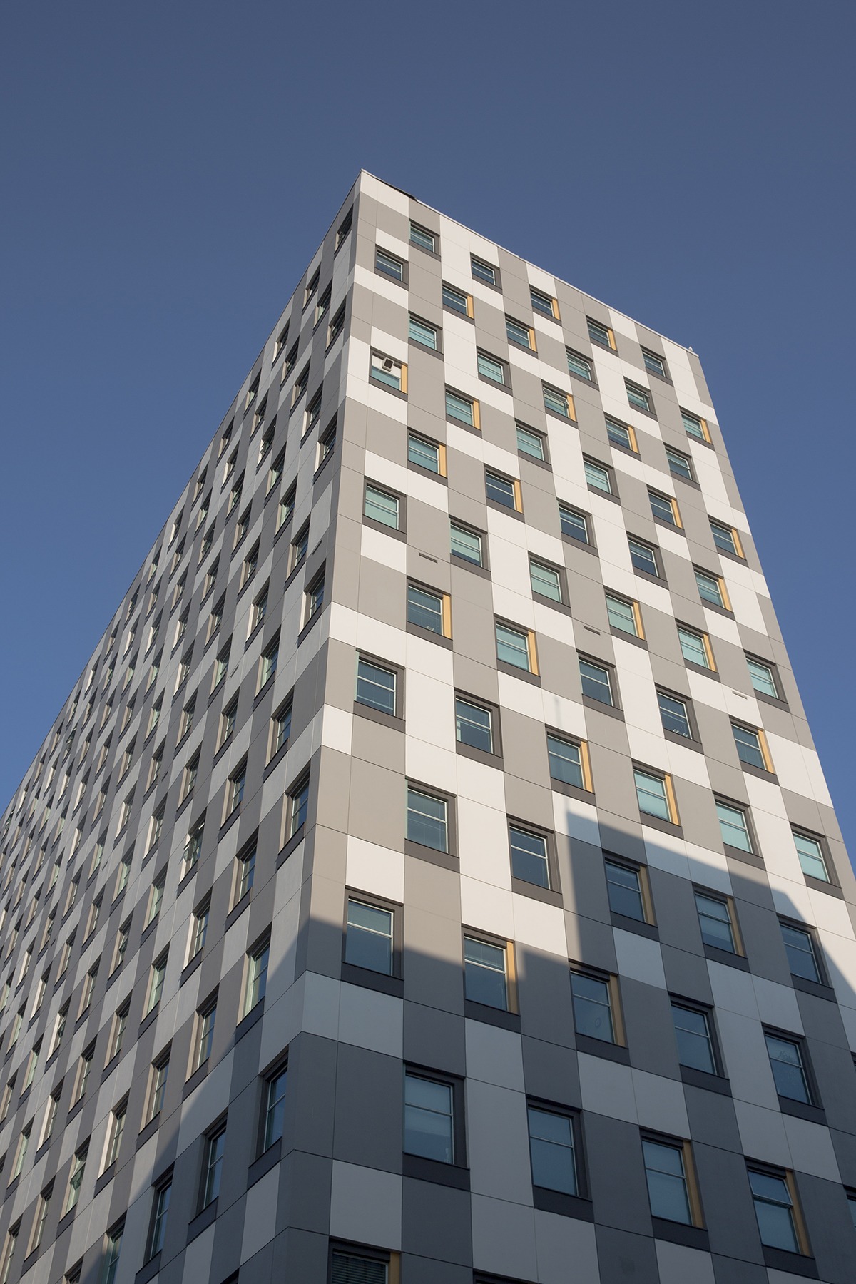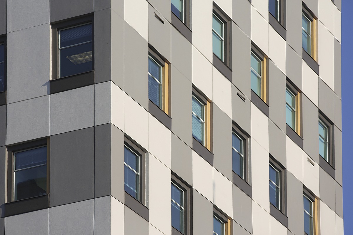 In the 1990s, its mosaic-tile facade was covered with Exterior Insulated Finishing System (EIFS) panels to improve energy efficiency. The present-day retrofit retains these panels while introducing a tri-colour paint pattern that recaptures the visual interest of the original mosaic tiles and highlights the building’s modernist geometry. Coloured accents at the window edges add extra detail as one approaches the building. The bold, geometric design of the exterior façade interacts with the urban context, addressing the skyline, street, and pedestrian perspectives.